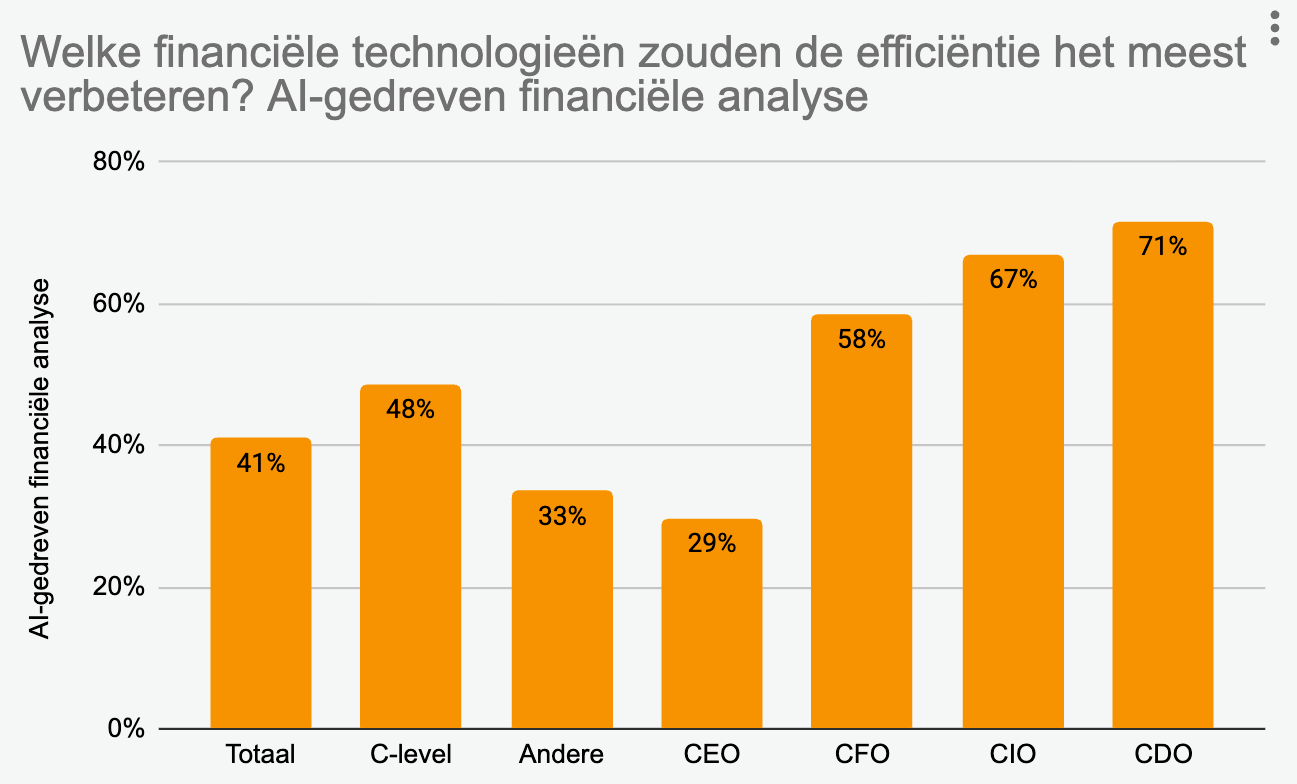Yet AI is primarily viewed as an opportunity. Nearly half of surveyed C-level executives (48%) believe the grass is greener on the other side. For them, AI-driven financial analysis is the technology most likely to improve efficiency within the finance function. Its relevance increases as respondents become more data-savvy.