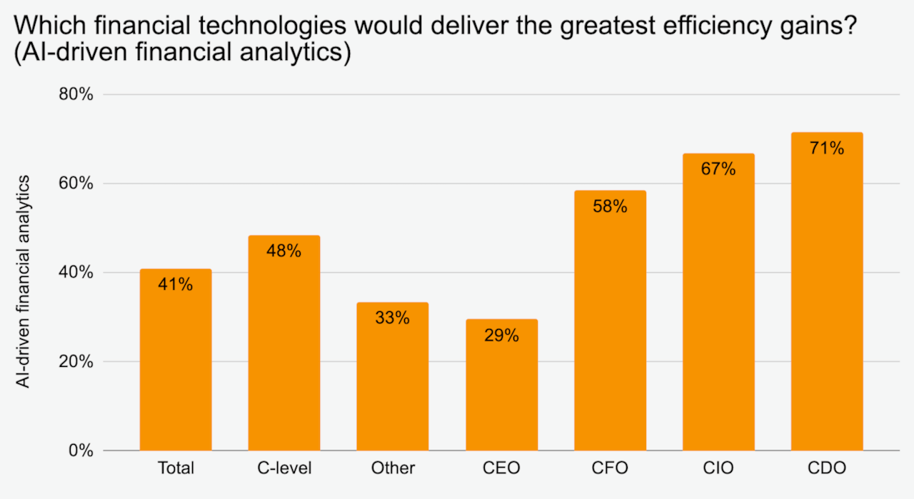 Yet AI is primarily viewed as an opportunity. Nearly half of surveyed C-level executives (48%) believe the grass is greener on the other side. For them, AI-driven financial analysis is the technology most likely to improve efficiency within the Finance function. Its relevance increases as respondents become more data-savvy.