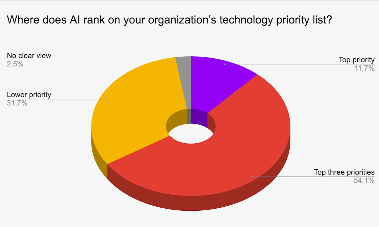 Nearly one-third of respondents (32%) consider AI a lower priority, while 2.5% admit they have no clear view of AI’s place on the technology agenda.