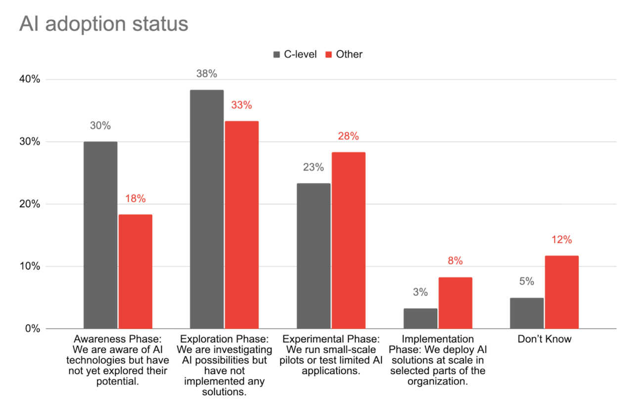 These figures on AI priority gain added significance when looking at role and seniority. Among C-level respondents, two-thirds (67%) report that AI ranks among their top priorities. For non-C-level respondents, AI is much more often considered a lower priority (45%).