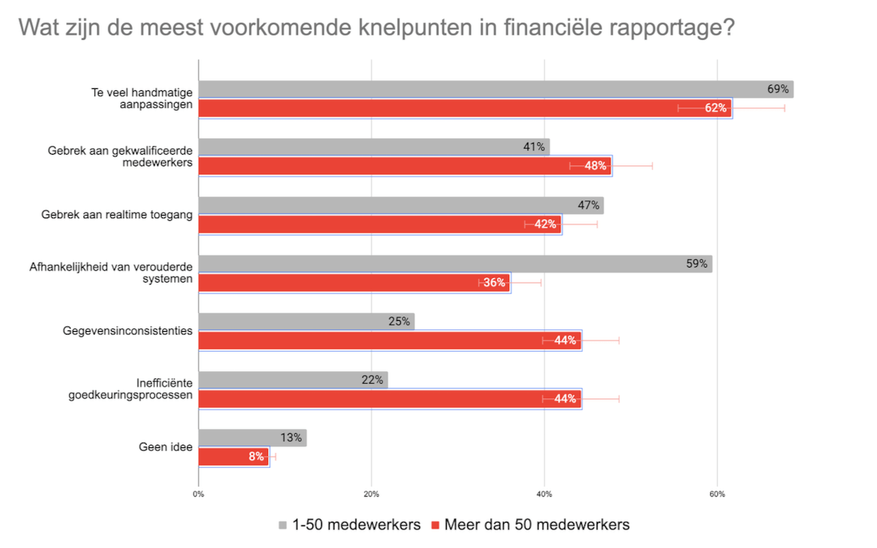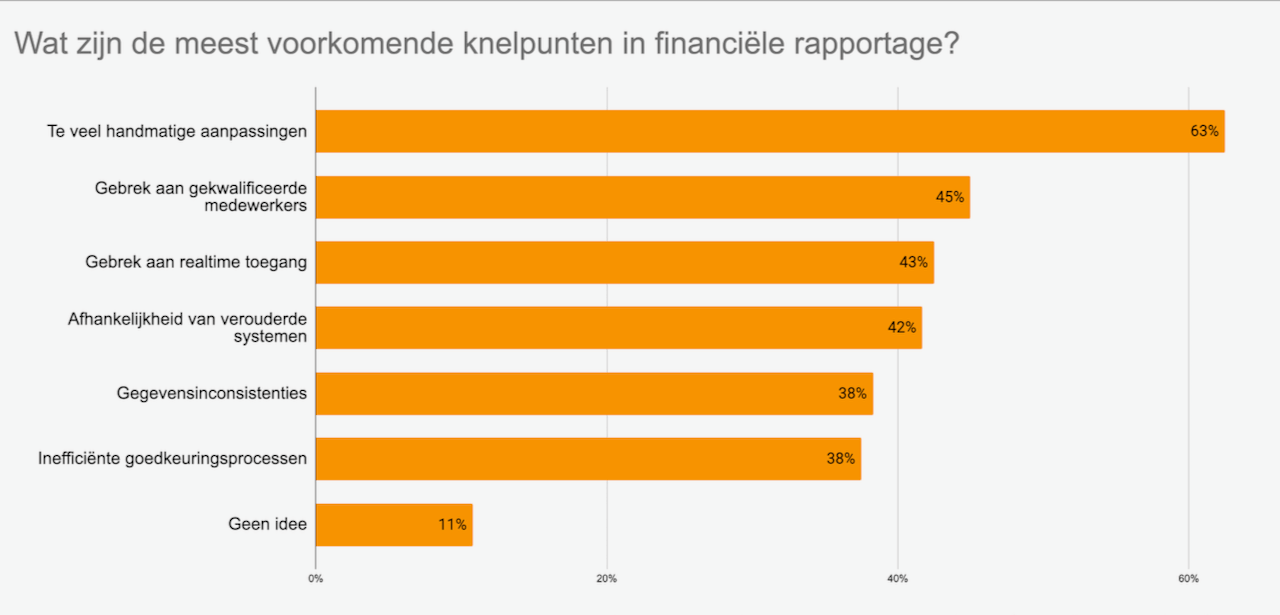The survey shows clearly how the challenges in financial reporting go deeper than just real-time access. The most frequently cited bottleneck is excessive manual adjustments (63%). Smaller organizations are particularly affected, with 69% reporting a heavy reliance on manual interventions. This points to Excel-driven processes, correction cycles, and time-consuming reconciliations, raising both the risk of errors and delays.