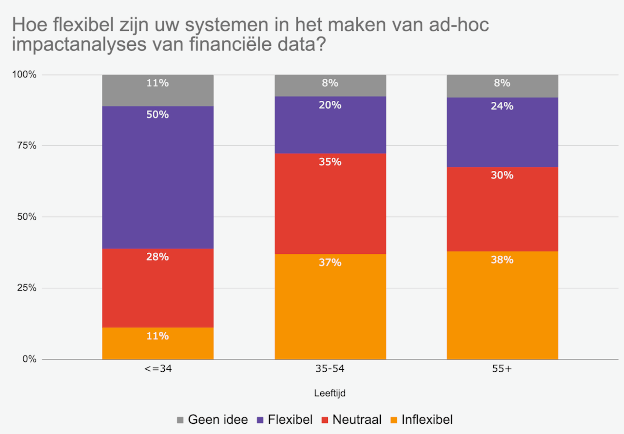Interessant zijn de verschillen naar leeftijd. Bij respondenten jonger dan 34 jaar geeft 50% aan dat hun systemen flexibel zijn. In de leeftijdscategorie 35–54 jaar daalt dat naar 20%, en bij 55+ naar 24%. Omgekeerd ligt de perceptie van inflexibiliteit aanzienlijk hoger bij de oudere leeftijdsgroepen (37–38%) dan bij de jongste groep (11%).